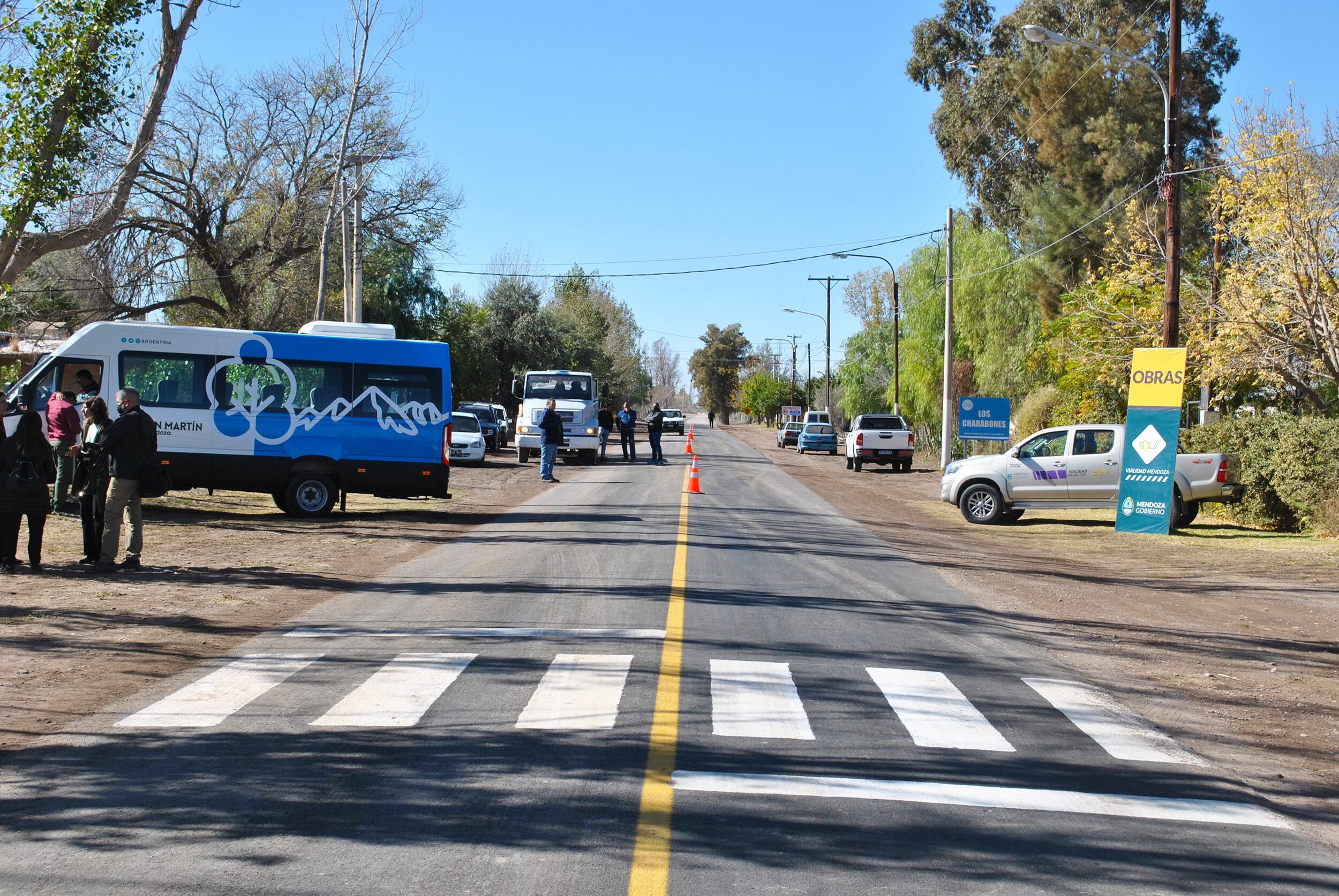El nuevo pavimento resalta entre las fincas y el conjunto de loteos típicos del distrito Montecaseros, camino al Barrio Los Charabones, ubicado a 13 kilómetros al Este del centro de San Martín.
