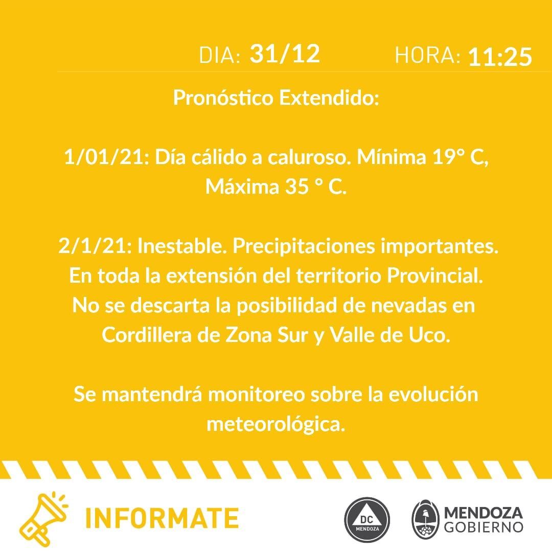 Según indicaron, el segundo día de 2021 se presentará inestable con importantes precipitaciones en todo el territorio provincial. Así mismo, no descartaron nevadas para la cordillera del sur provincial y para el Valle de Uco. Por esta razón advirtieron que mantendrán el monitoreo meteorológico para obtener mayores precisiones.
