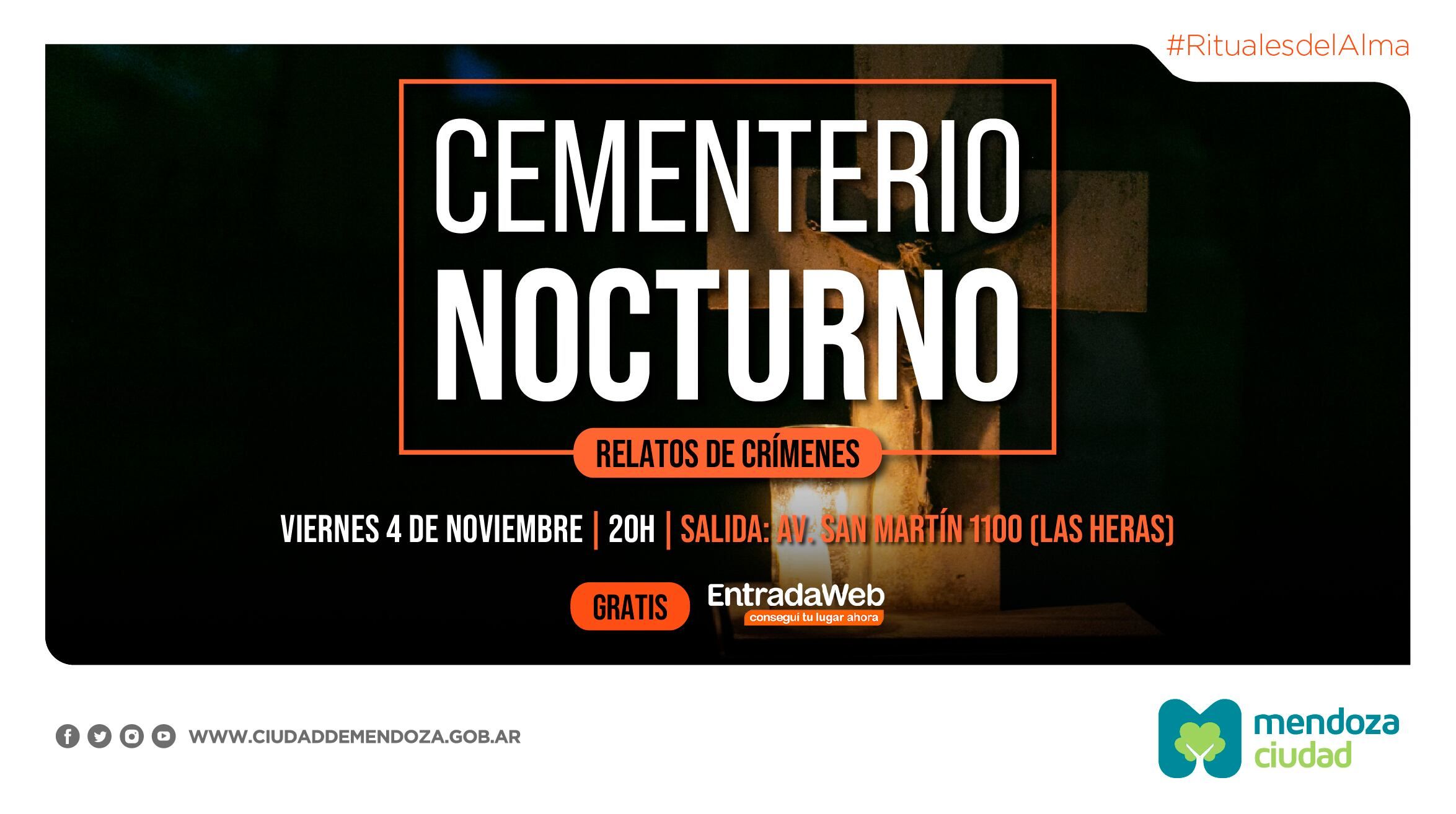 Y para concluir esta gran propuesta turística y cultural, el cierre de Rituales del Alma tendrá su broche de oro con Cuentos en el Cementerio. Se realizará el sábado 5 a las 20.30 y consistirá en un recorrido por los pasillos del mencionado espacio, el encuentro con artistas mendocinos y un viaje imaginario a través de relatos escalofriantes, llenos de misterio.