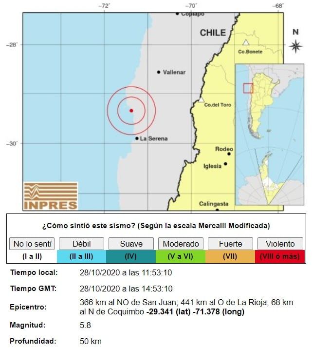 Por su parte, el Inpres informó que el sismo ocurrió a las 11: 53. Como referencia con nuestr país, el epicentro fue medido a 366 kilómetros al noroeste de San Juan.