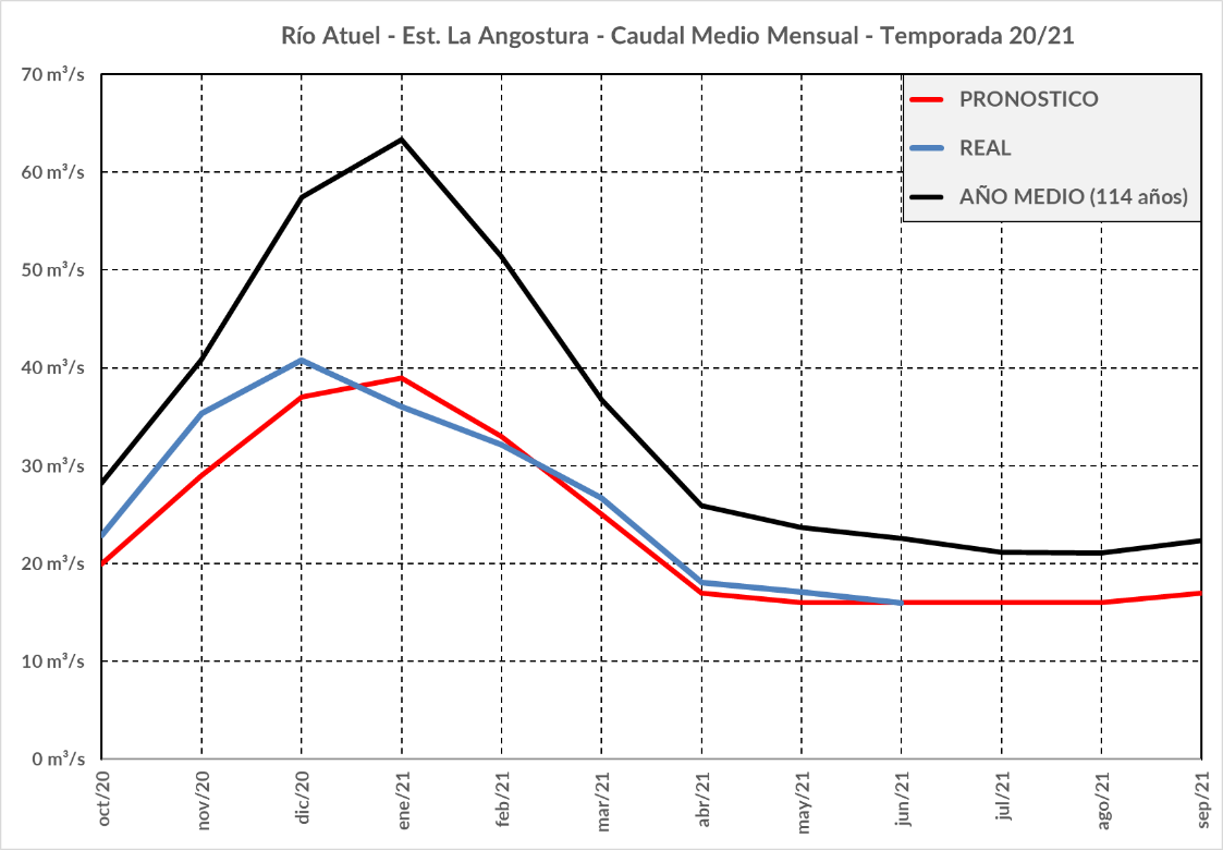 El Pronóstico de Escurrimientos de los ríos, presentado en octubre del año pasado, mostraba que la oferta del recurso hídrico esperado para esta temporada (01/10/20 al 30/09/21), volvería a ser más seca que un año normal, en todas las cuencas de la provincia.