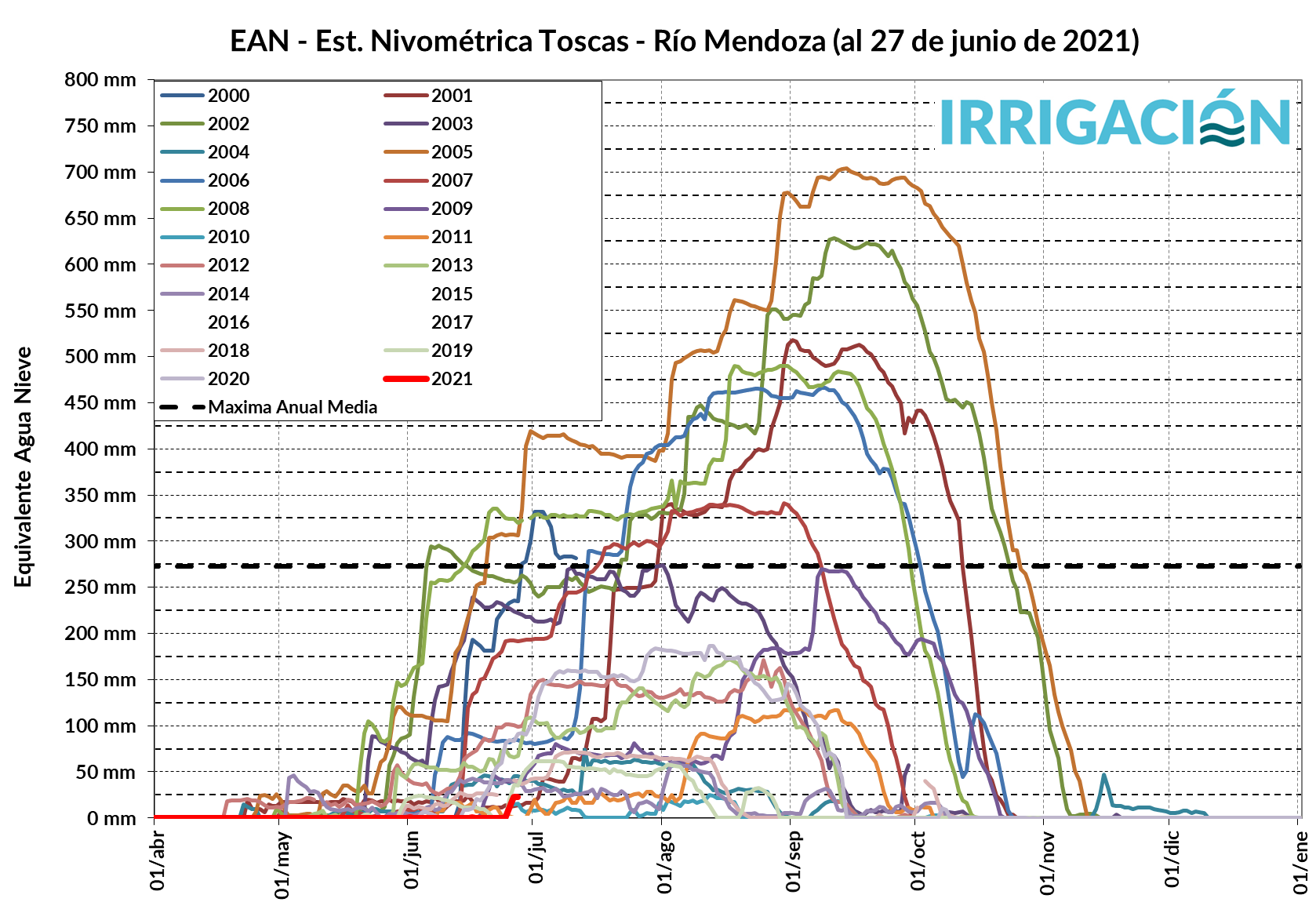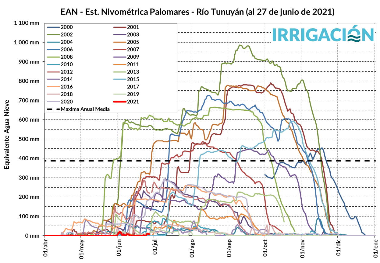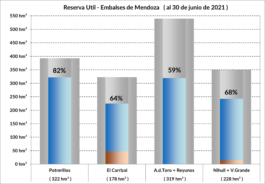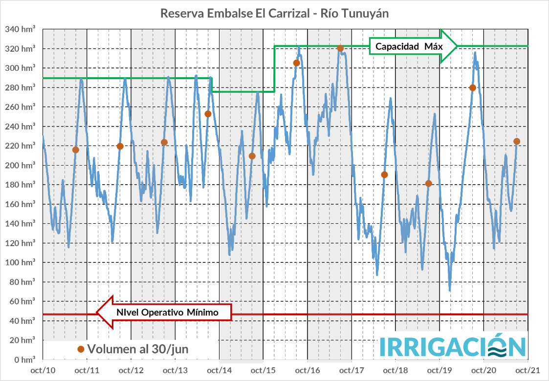 La variación de la reserva de El Carrizal muestra que la situación actual es más desfavorable que la del 2020. Cabe aclarar que el aporte que hacen los arroyos del Valle de Uco al río, hacen que la situación para iniciar la temporada de riego que viene, sea cercana a la normal, o sea, en la primera quincena de agosto de 2021.