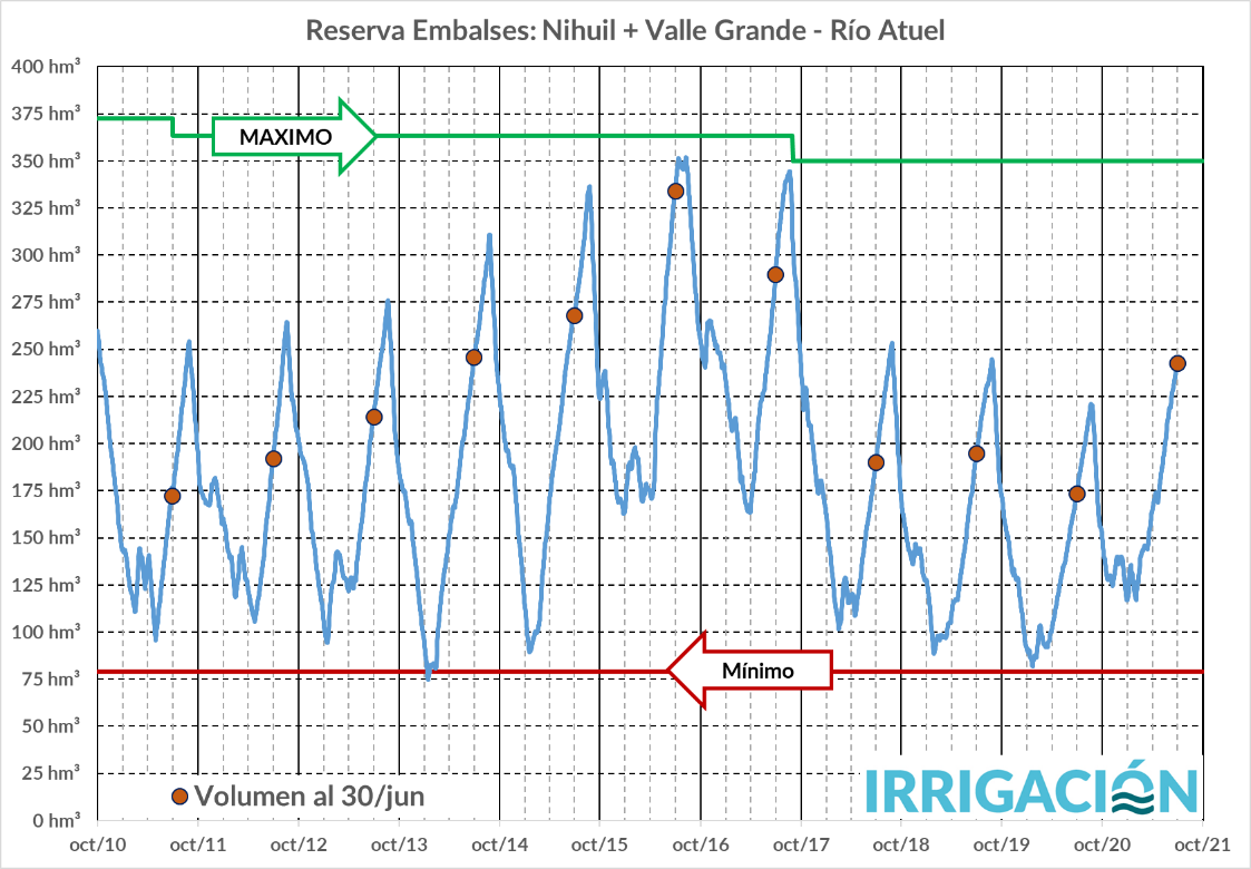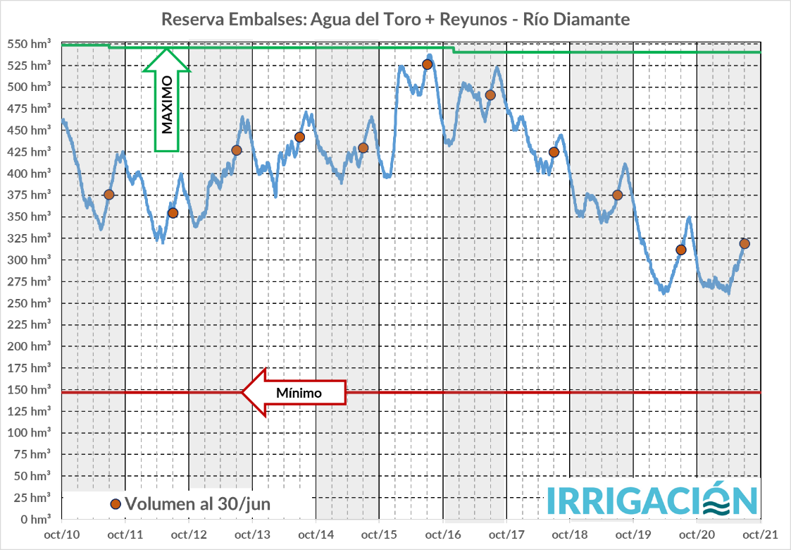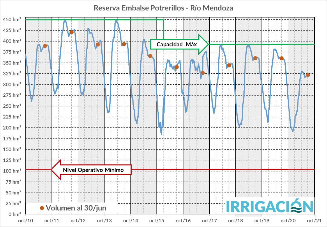 En la figura anterior se ve la evolución de la reserva en el Dique Potrerillos, para los últimos 11 años. Se puede apreciar que para la fecha indicada (30 de junio), el embalse se encuentra en los valores mínimos de esta década. Esto se debe a los menores caudales que se han producido y a los usos que se han realizado durante la actual temporada.