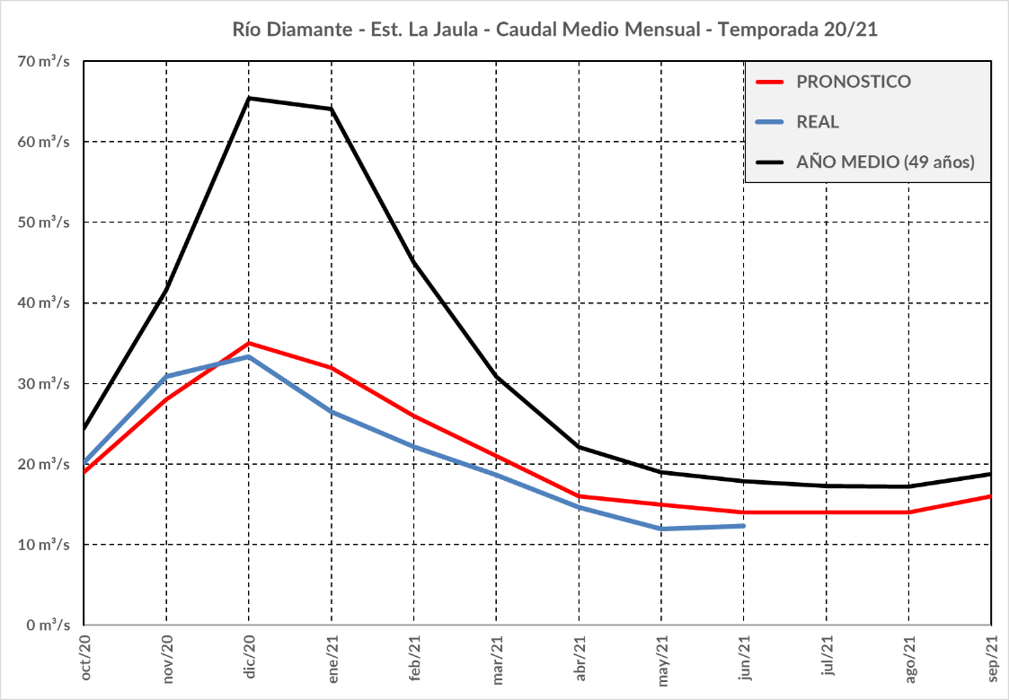 Los caudales del río Diamante han sido, en esta temporada, los más bajos en relación a su valor normal (58%), aunque la diferencia respecto de los pronosticados, es sólo del 9%, por lo que su comportamiento general, está dentro de los esperado.