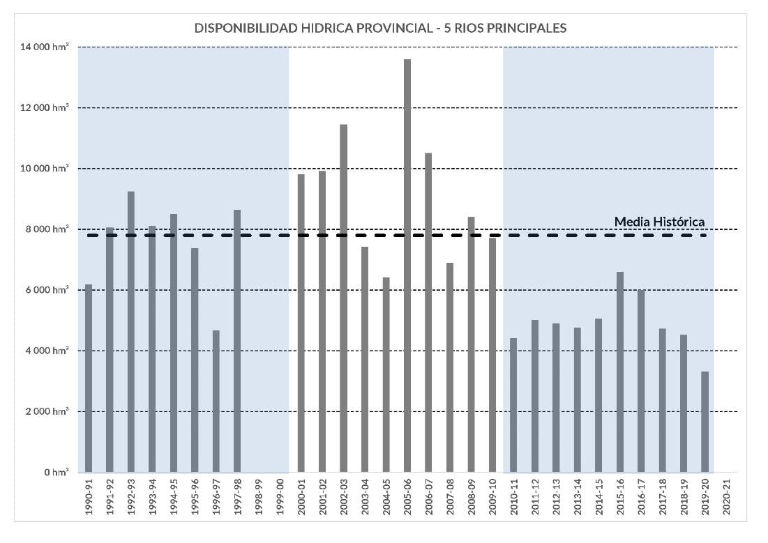 Si se tienen en cuenta los 5 ríos más grandes de la provincia (Mendoza, Tunuyán, Diamante, Atuel y Grande) en la temporada 2019/2020 la disponibilidad hídrica total fue del orden de 3450 hm³, siendo los valores medios históricos de aproximadamente 7730 hm³. Esto equivale a que la oferta de la temporada pasada fue del 45% de un año medio.