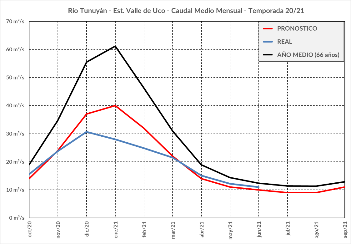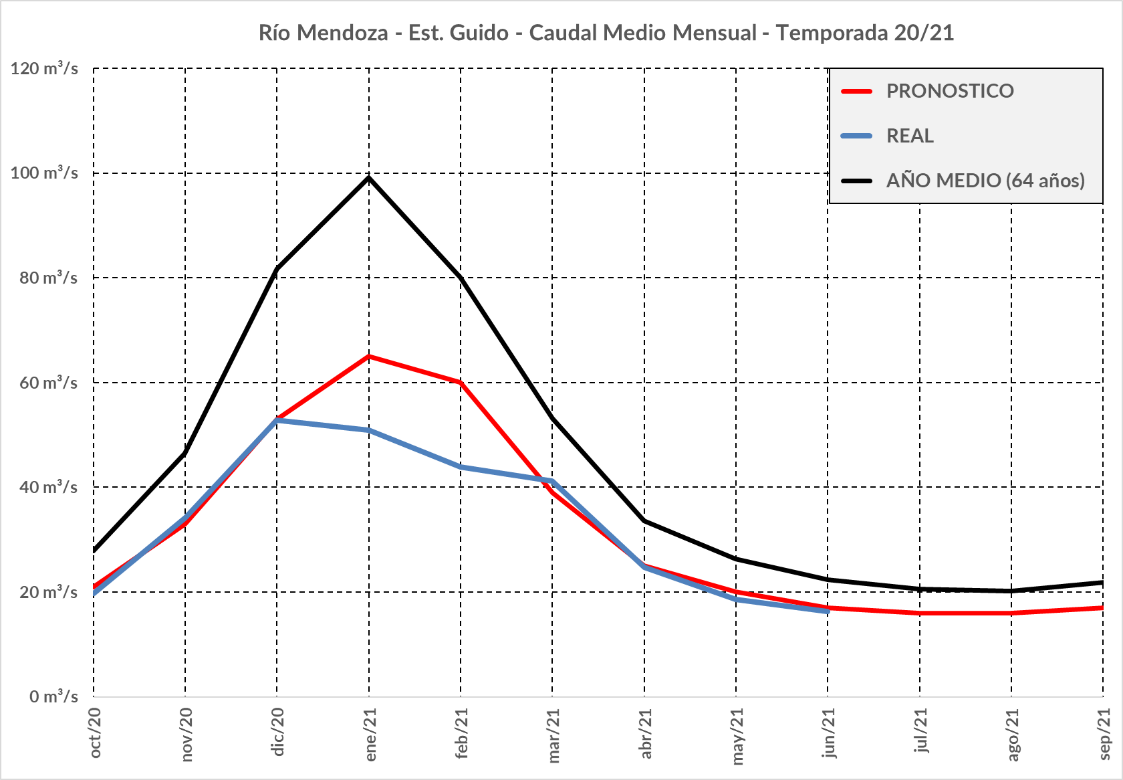 El comportamiento de los escurrimientos del Río Mendoza ha sido totalmente atípico en este verano, teniendo su valor máximo en diciembre en vez de enero. Posteriormente, los caudales han tenido valores muy ajustados a los pronosticados (de marzo a junio). La diferencia acumulada entre lo pronosticado y lo realmente escurrido, para este río es del orden del 10%.