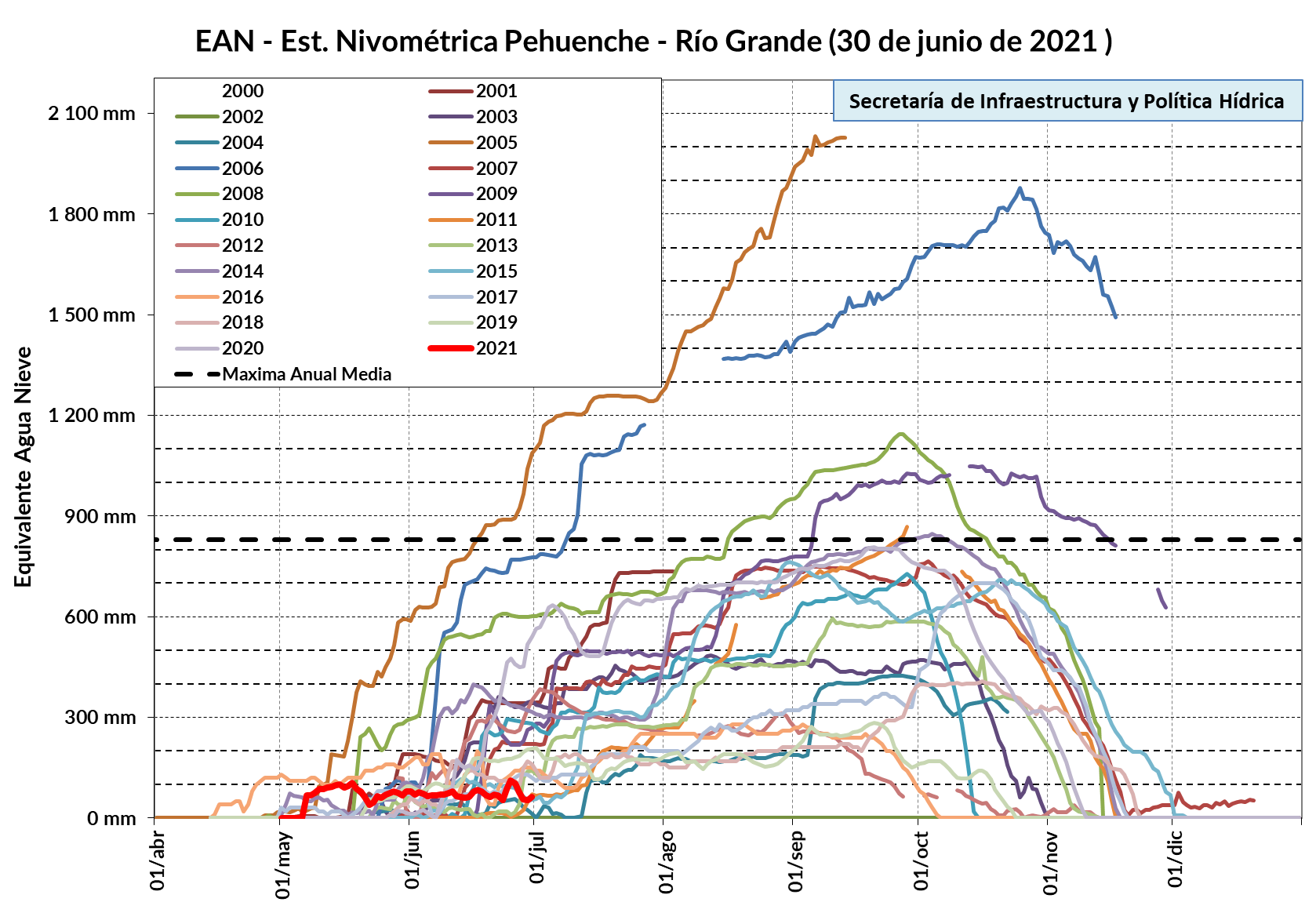 El último temporal produjo nevadas de entre 15 y 40 cm en las estaciones nivométricas, con valores mayores en las cuencas de los ríos Mendoza y Grande. Se ha pronosticado una nueva nevada, similar a la anterior, para el fin de semana del 9 de julio.