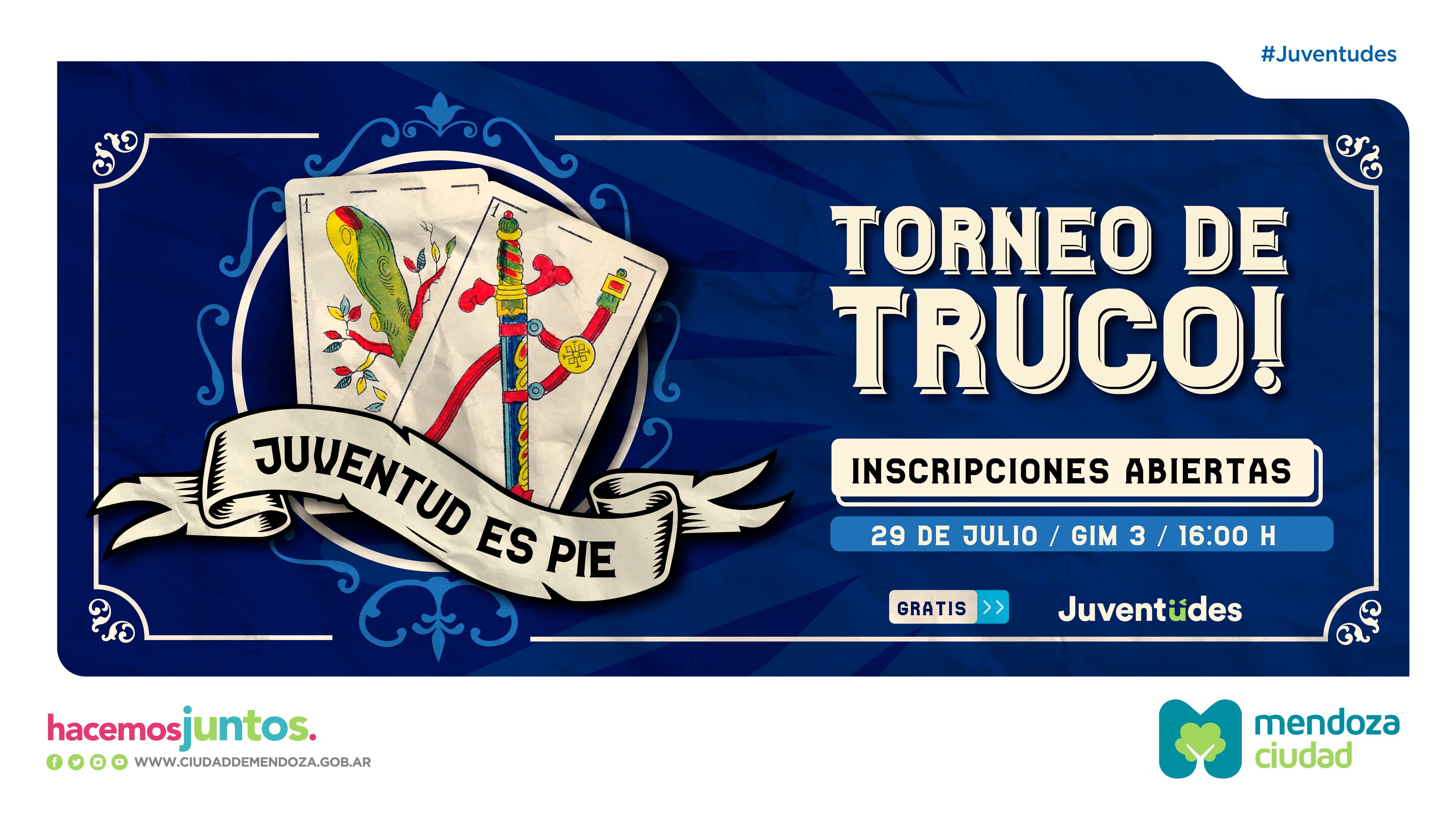 La Ciudad de Mendoza invita a personas de entre 15 a 36 años a participar del Torneo de Truco que celebrará el próximo 29 de julio. Será en el Gimnasio 3 (Ayacucho 349), de 16 a 20, con inscripción previa por este enlace.