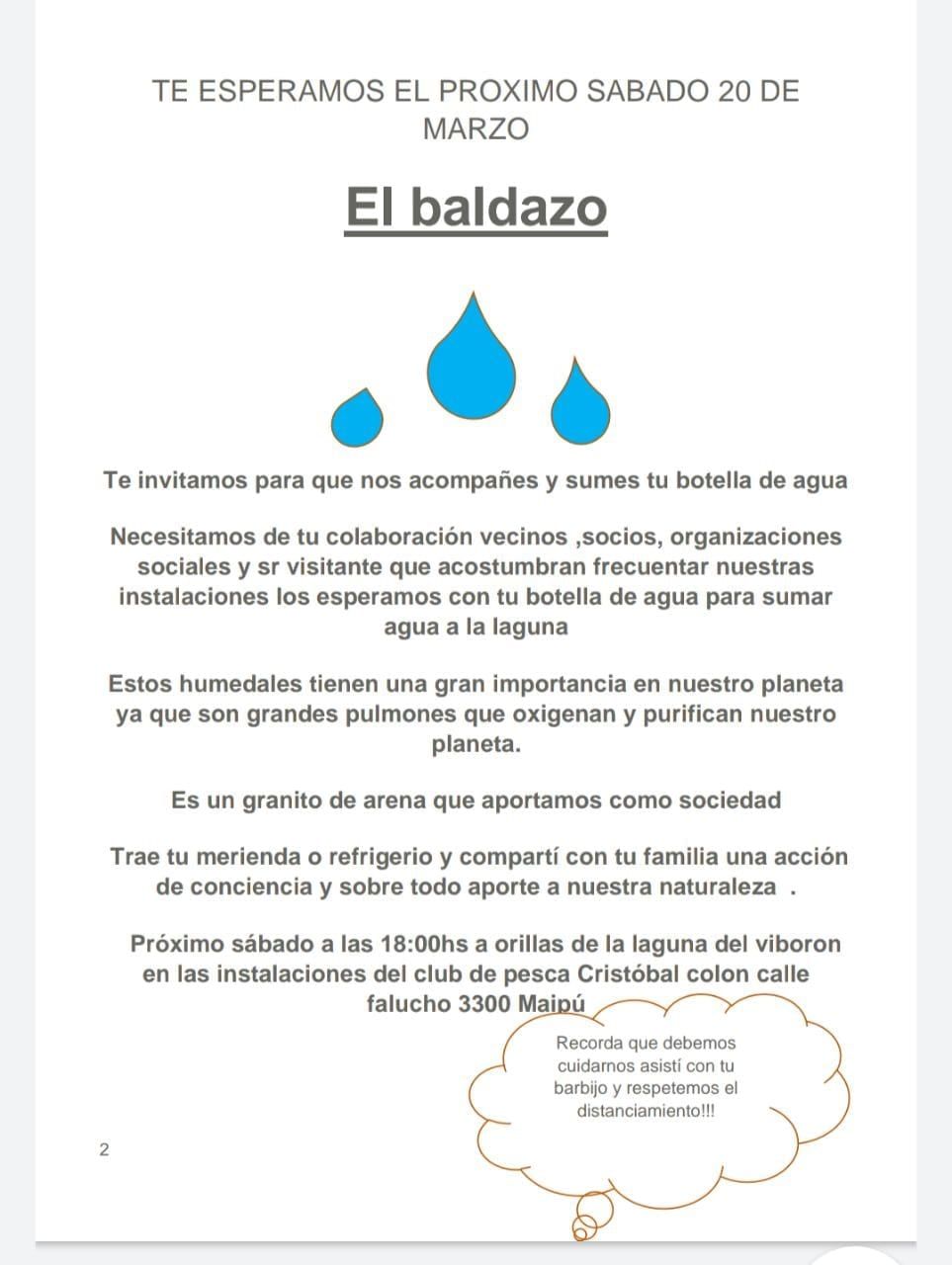 Es por eso, que invitan a vecinos, socios, organizadores sociales y visitantes que acostumbran a frecuentar las instalaciones a llevar el día sábado 20 de Marzo, específicamente en la costa del Club de Pesca Cristóbal Colón de Maipú, una botella de agua para poder aumentar el nivel de la laguna.