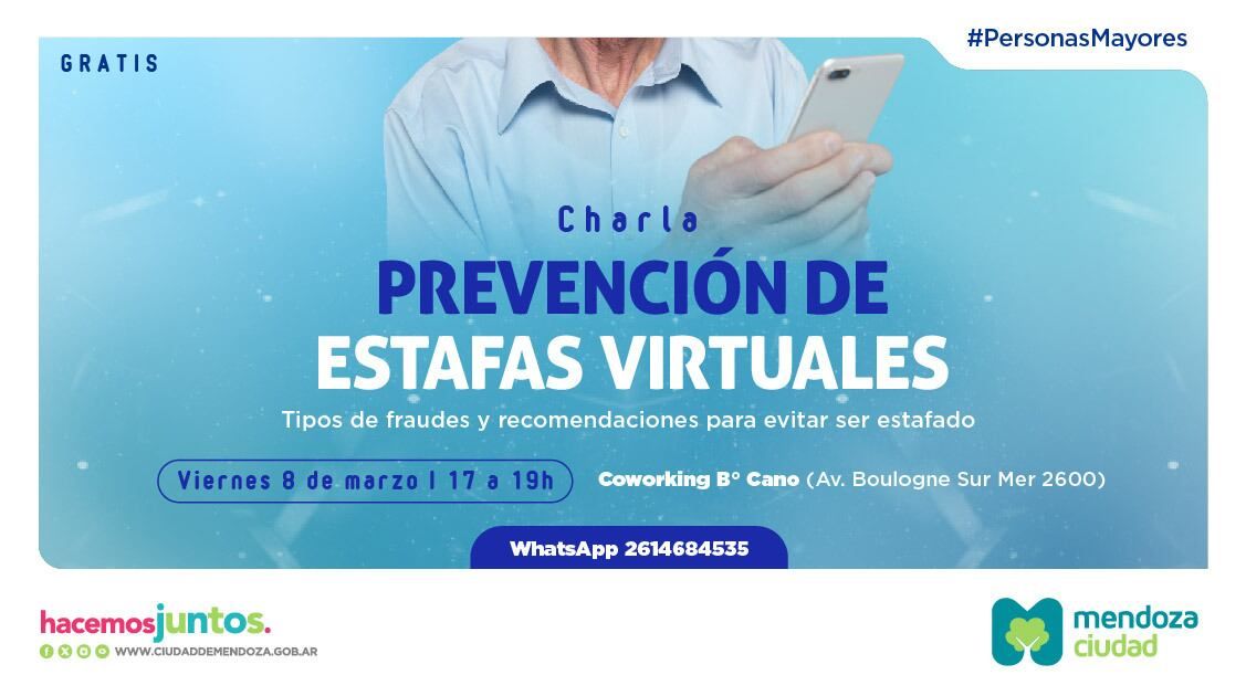 La Ciudad de Mendoza invita a personas mayores a participar de la nueva charla gratuita de prevención de delitos. La misma se celebrará el viernes 8 de marzo, de 17 a 19, en el espacio Coworking del barrio Cano (Boulogne Sur Mer 2600).