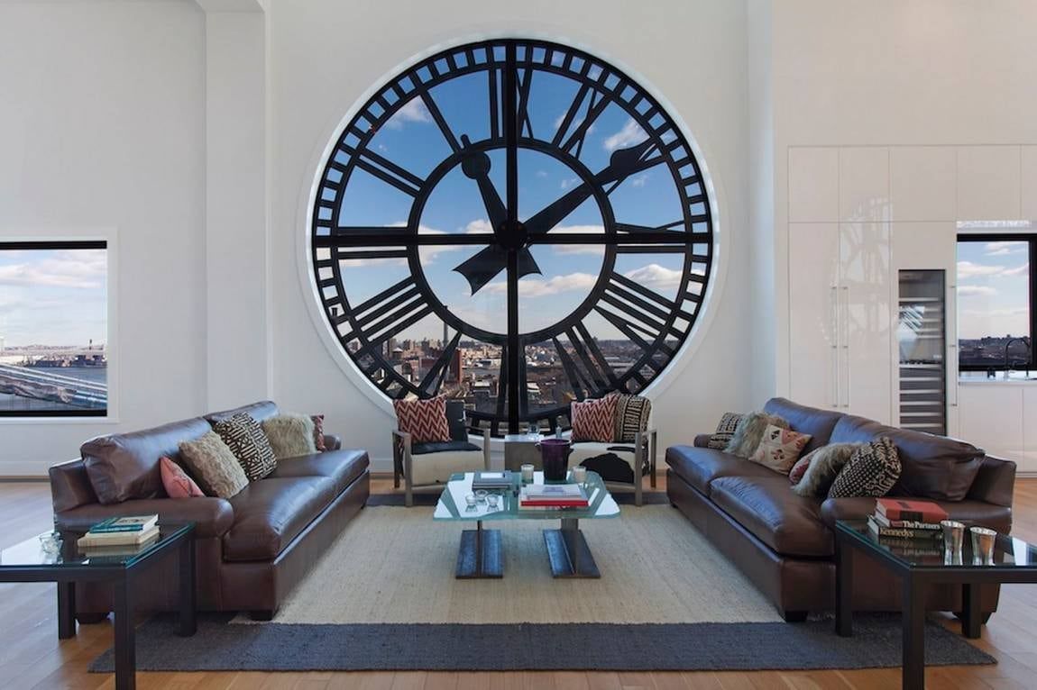 Una forma muy original de aprovechar una ventana circular, que consiste en instalar un reloj de agujas para conseguir cierta similitud con los relojes de las fachadas de las construcciones antiguas.