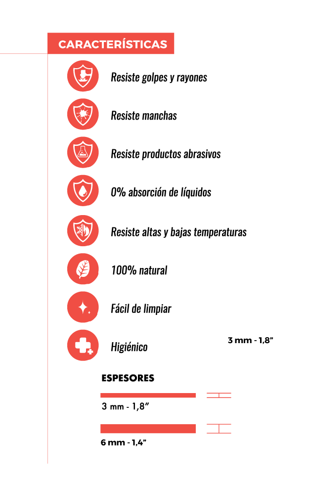 Las características distintivas de estas láminas le otorgan un mix entre practicidad y calidad: resiste golpes y rayones como también manchas y productos abrasivos; tiene 0% de absorción de líquidos; resiste altas y bajas temperaturas; es 100% natural; su superficie es higiénica y fácil de limpiar.