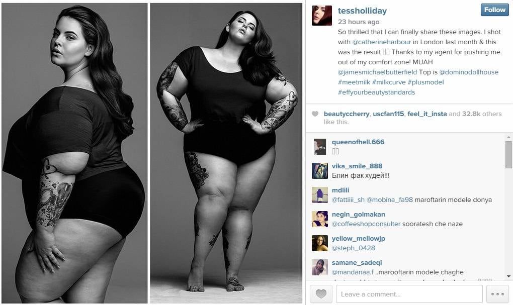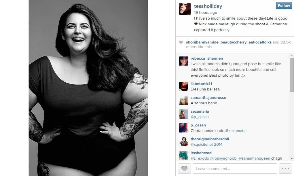 Desbordada de felicidad, Holliday compartió en Instagram las fotos de su primera sesión con dicha agencia, en la que se ha apostado por el blanco y negro. Tess luce camiseta y ropa interior negra, y sus numerosos tatuajes en las instantáneas.
