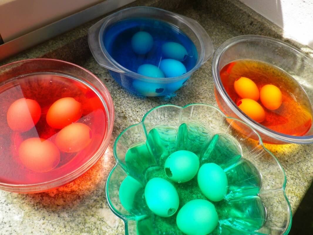 Uno: ¡Los huevos de Pascua pueden pintarse en casa! Lo único que hay que hacer es elegir los colores a aplicar. Elija una verdura que tenga ese color. Píquela. Coloque 200 gramos de esa verdura en un litro de agua con una cucharada de vinagre y déjela hervir durante 30 minutos.
