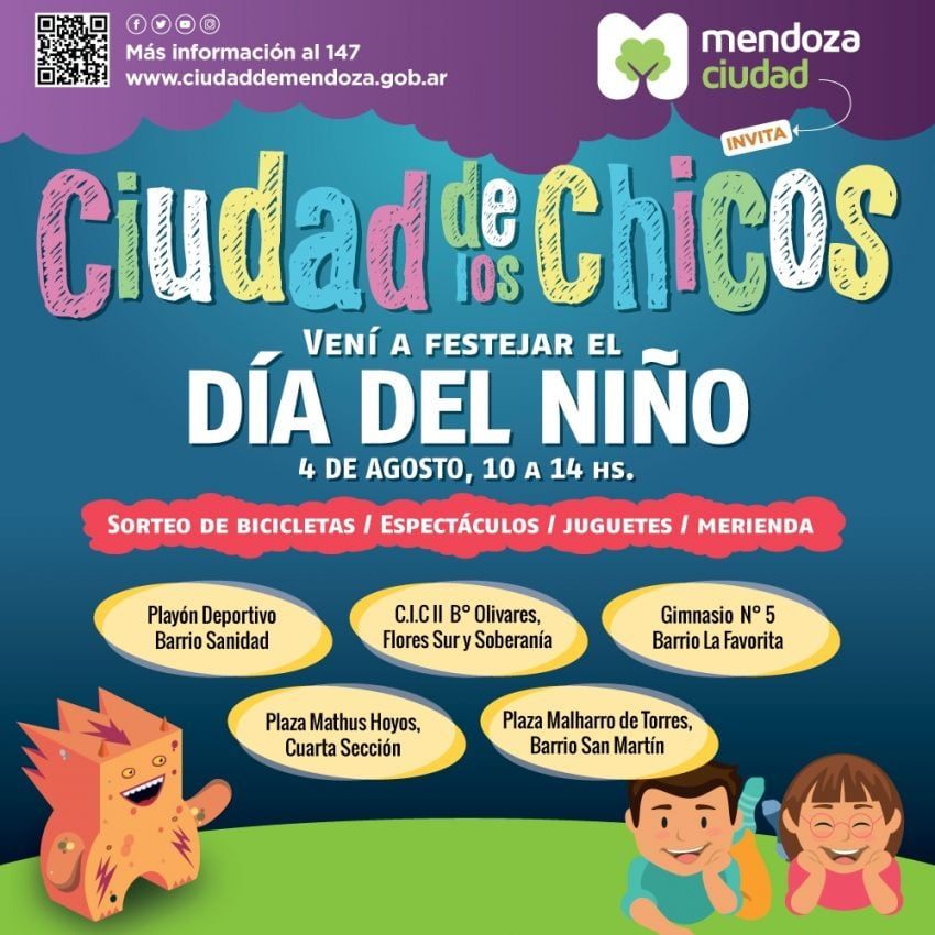 En cinco distintos espacios de la Ciudad de Mendoza, se adelantán los festejor por el día de los niños y las niñas. Habrán sorteos de bicicletas, distintas actividades recreativas, música y merienda para los más chicos. El horario de los festejos es de 10 a 14, con entrada libre. Las sedes de las celebraciones serán el Playón Deportivo del Barrio Sanidad, el C.I.C. II del Barrio Olivares, el Gimnasio N° 5 del barrio La Favorita, la Plaza MAthus Hoyos y la plaza Malharro de Torres, del barrio San Martín.
