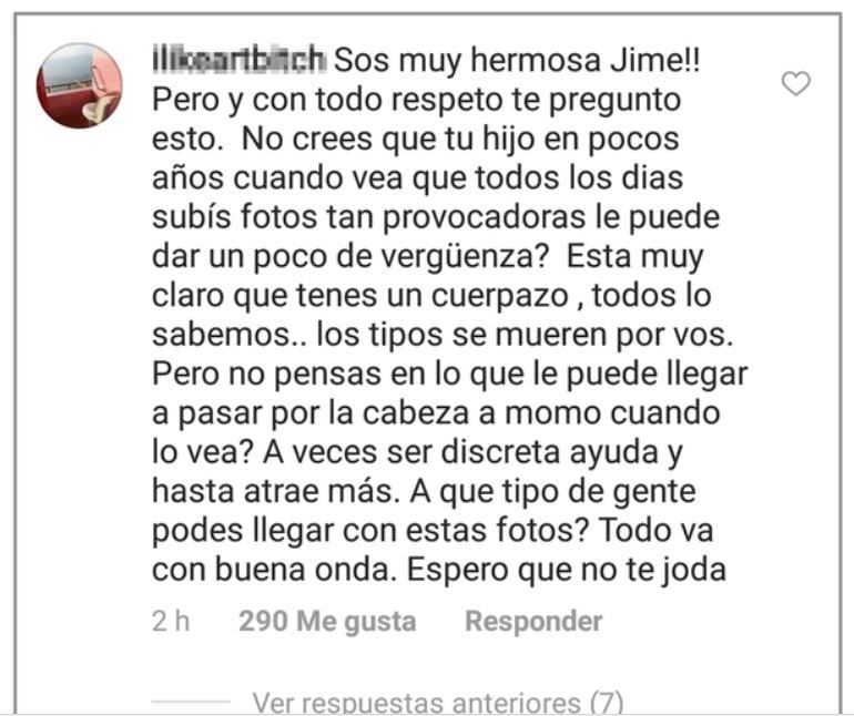 Así las cosas, una envidiosa -porque qué más puede ser, qué más- se la jugó a comentarle a Jimena en su posteo de Instagram: "Con todo respeto te pregunto, ¿no creés que en pocos años a tu hijo, cuando vea que todos los días subís fotos tan provocadoras, le podría dar un poco de vergüenza? Está muy claro que tenés un lomazo, los tipos se mueren por vos, ¿pero no pensás en lo que le puede llegar a pasar por la cabeza a Momo cuando lo vea?".