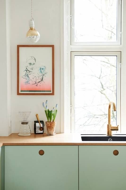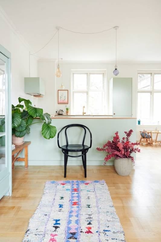Sus dueños confiesan que elegir el tono adecuado fue difícil. No lo querían muy cálido y tampoco hacia la paleta de los azules. Para rebajar su frescor y luminosidad optan por una fantástica mesada de madera a juego con los tiradores de los cajones. Estos tonos no solo se quedan en la cocina, sino que se extienden por todo el hogar, en el que los marrones y blancos se combinan con pinceladas del verde mint.