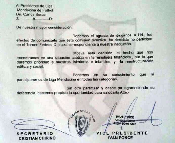 De todos modos, la plaza a Luján le correspondía por su descenso del Federal B y no a la Liga Mendocina de Fútbol.