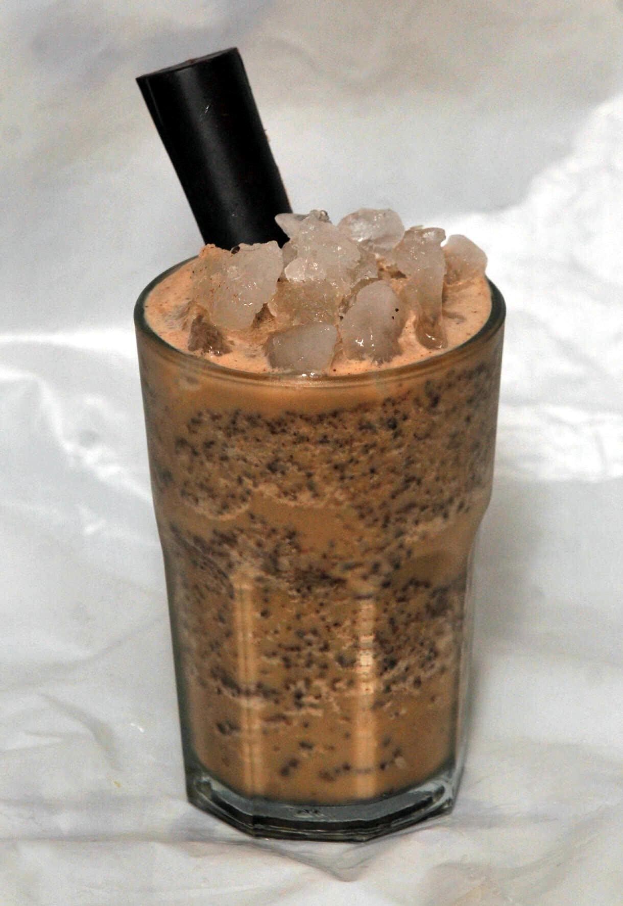Paso a paso: colocar todos los ingredientes en una licuadora con hielo en escamas y licuar con alta potencia. Servir en vaso alto, y colocar chocolate rallado encima.