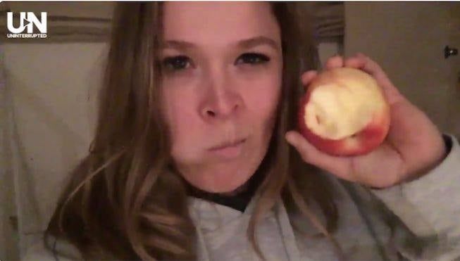Tras las graves lesiones maxilares sufridas en la pelea ante Holly Holm (noviembre 2015), la estrella de UFC le había prometido a sus fans que iba a comer una manzana y lo hizo a los cuatro meses de aquella tremenda derrota.