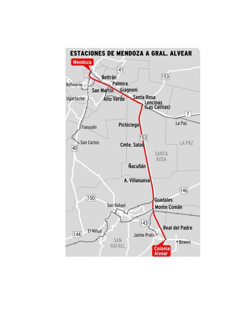 El tren salía de Mendoza y sucesivamente iba cruzando las estaciones de Godoy Cruz, Luzuriaga, General Gutiérrez, Coquimbito, General Ortega, Rodeo del Medio, Fray Luis Beltrán, Barcala, Palmira, General San Martín, Ingeniero Giagnoni, Alto Verde, Santa Rosa y Las Catitas (llamada José Néstor Lencinas), en un recorrido de algo más de 90 kilómetros.