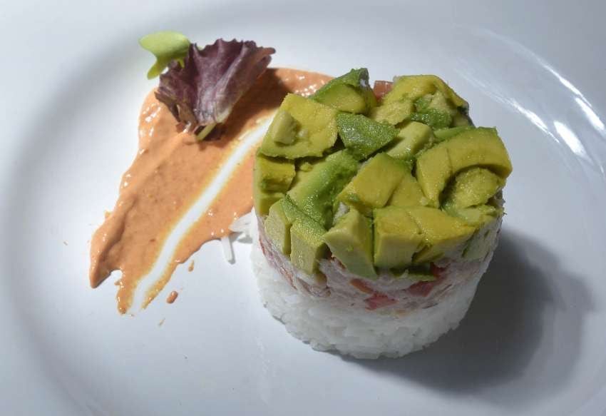 En un molde colocar una capa de 3 centímetros de arroz; luego, 3 centímetros de salpicón y coronar con palta cortada en cubitos. Agregar sal y pimienta, rociar con oliva y limón. Por último, decorar con la salsa golf.