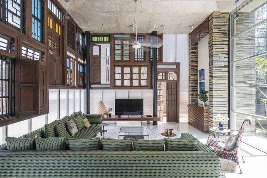 La fachada principal está dedicada al reciclado de viejas ventanas y puertas de viviendas demolidas en la ciudad. Convirtiendo el interior en el espacio de estar más grande de la vivienda, complementándose con el hormigón visto, la piedra pulida de color blanco, tuberías metálicas son dispuestas en forma de muro y elementos estructurales.