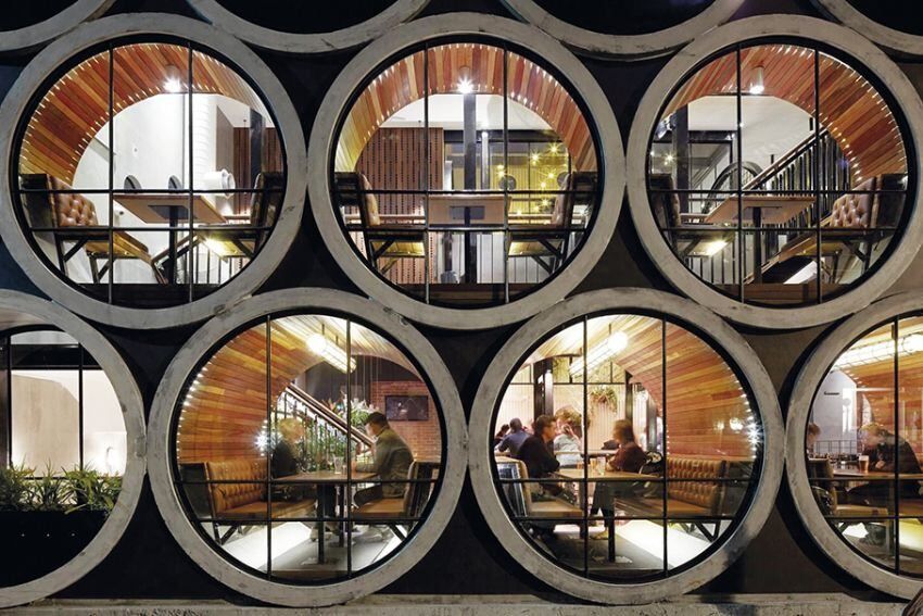 El segundo caso es el hotel Prahran de Techne Architecture + Interior Design. Un edificio de dos plantas ubicado en una esquina, compuesto por una construcción de líneas estilo art deco y una adición de grandes tubos de concreto apilados. Las razones de esta decisión fueron múltiples: los tubos tienen profundidad, pudiendo ser espacios interactivos, tienen una cualidad dramática y escultural a la vez. Hacen referencia a barriles apilados, completando la composición de líneas circulares.
