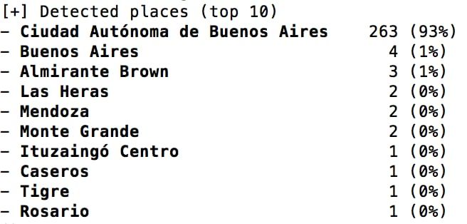 La geolocalización de sus tuits está activada por lo que le aconsejo a Julieta que la desactive ya que ingresando a la api de Twitter puedo escribir un csv con todos los lugares que ha recorrido en Mendoza y Buenos Aires a lo largo de su historia en la red social y formar un patrón de comportamiento basado en geolocalizaciones. No voy a mostrar eso. Si lugares en general que Twitter ya usó para generar dicho informe.