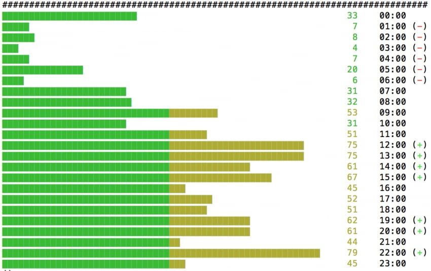 Los menos y más que ves en la imagen, son sentimientos de los tuits. Podemos observar que en la noche, se generaron tuits que para la red social han sido de sentimiento negativo mientras que durante el día, fueron todos positivos.