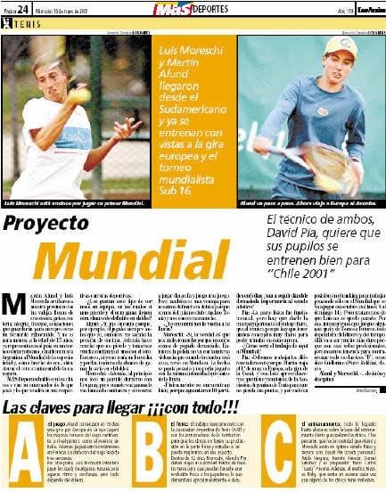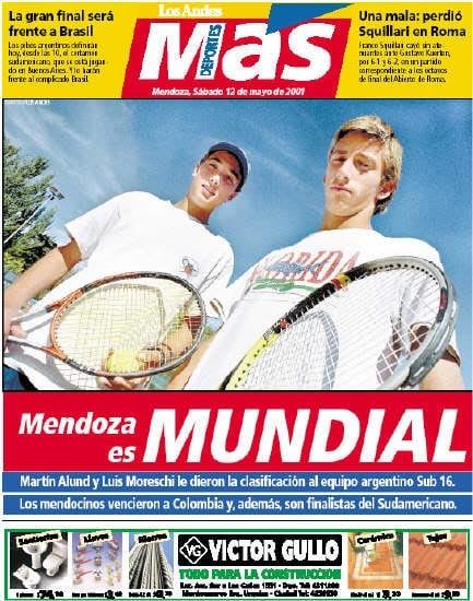El 2001 no sólo fue un gran año para Mendoza por haber recibido la Copa Davis y todo lo que ella generó, sino que quedará en la historia de nuestro tenis porque por primera y única vez, dos jugadores mendocinos integraron el equipo nacional de cadetes que no sólo se coronó campeón sudamericano, sino que se quedó con la medalla de bronce en el Mundial de la categoría. Ellos fueron Martín Alund y Luis Moreschi, un dúo dinámico. Claro que no puede dejar de mencionarse a David Pía, quien fue el entrenador de ambos.