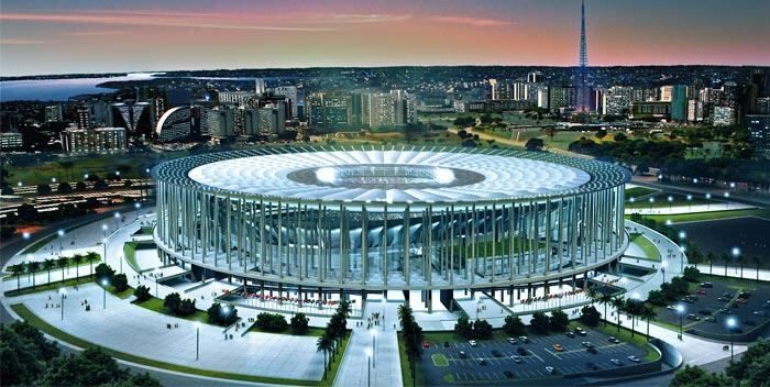 Es uno de los recintos más imponentes y el segundo más grande (con capacidad para 69.349 espectadores) de la Copa. El antiguo Estadio Nacional Mané Garrincha, prácticamente demolido, ostenta una nueva fachada, con un techo de estructura metálica, nuevas gradas y césped rebajado para permitir una visión completa del juego. Con un proyecto de edificación ecológico, centrado en la ausencia de emisiones de carbono, el reciclaje y el acceso total por medio del transporte público, consolida el nombre de la capital como referencia mundial en planificación sostenible. Fue elegido para recibir siete encuentros de la Copa Mundial. Realizado por la oficina Arquitectos de Castro Mello. Por Esp. Arq. Nidia Álvarez