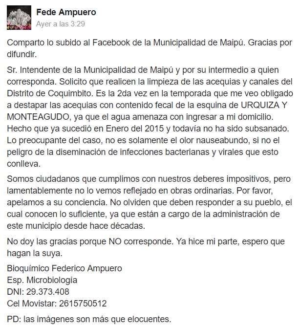 Este año, luego de las importantes lluvias ocurridas durante los últimos meses, Federico a vuelto a tener el mismo problema. Pero en esta ocasión decidió hacer el reclamo a través de la red social.