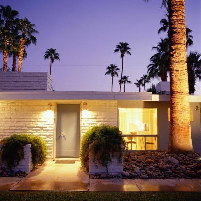 No es precisamente una casa de playa, pero sí una casa que esté a poca distancia del mar o incluso en un lugar seco, y que a la vez esté cerca de la ciudad. Apuesta por los colores blanco y crema. Es imprescindible que tenga palmeras enmarcando la casa, así como arbustos resistentes al calor. No es necesario sufrir por el césped en el frente: se pueden usar guijarros decorativos para darle un toque único.