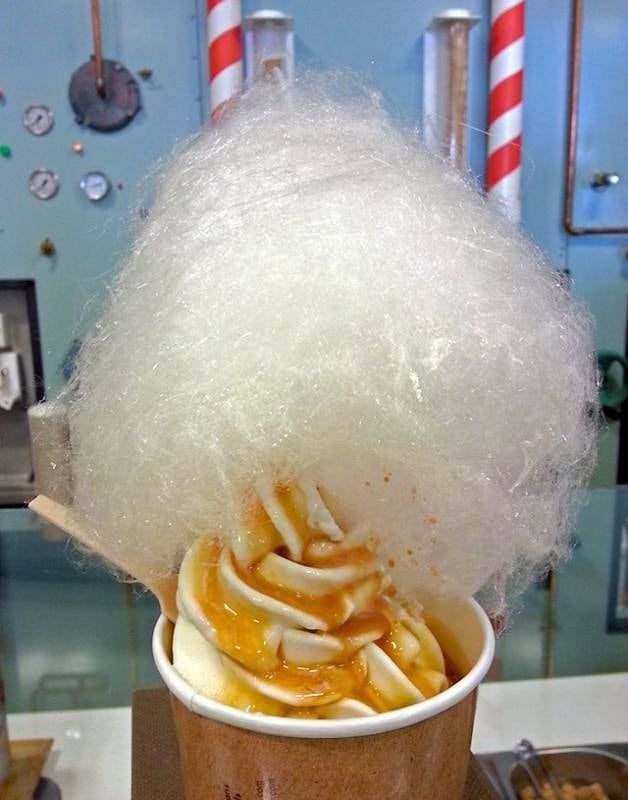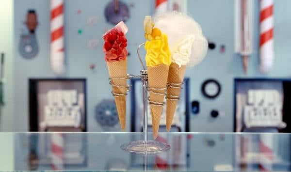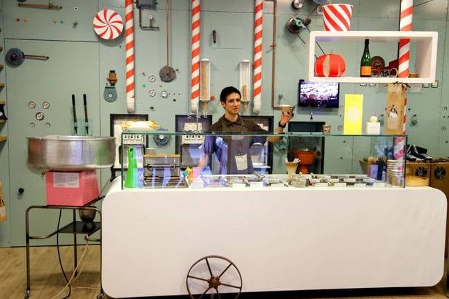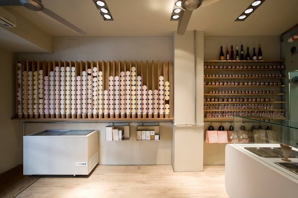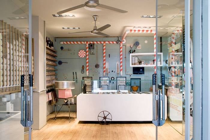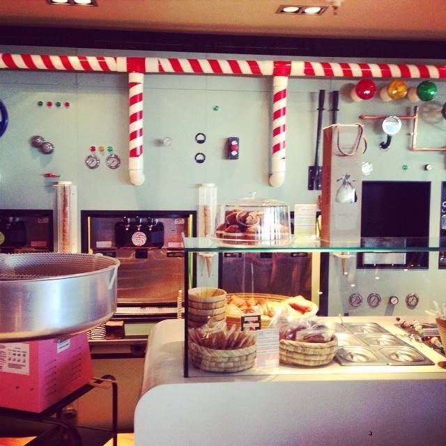 Las fuentes y las canillas, que vierten los helados más finos (en seis sabores diferentes) recuerdan inmediatamente a las fuentes de chocolate de la fábrica de Willy Wonka. Con hasta 34 coberturas sensacionales para agregar al helado, incluso un sabor al paladar tan finamente sintonizado que Willy Wonka seguramente, quedaría satisfecho. La firma de diseño Run fue invitada a colaborar en los gráficos únicos para los interiores, así como el packaging y la identidad corporativa de la pastelería.