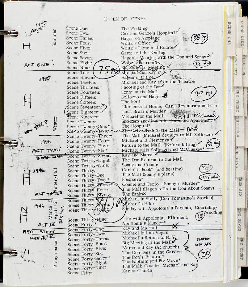 Los guiones incluyen algunos garabatos y pensamientos de Puzo en lo que el Instituto de Cine Estadounidense calificó como la segunda cita más famosa en la historia del cine, cuando Marlon Brando, como Don Vito Corleone, dice: “Voy a hacerle una oferta que no podrá rechazar”. (La cita más memorable del cine es “Sinceramente, cariño, me importa un bledo”, de “Lo que el viento se llevó”).