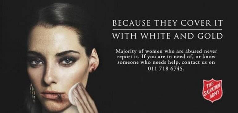 "¿Por qué es tan difícil verlo negro y azul? La única ilusión es si vos crees que fue su elección. Una de cada seis mujeres es víctima de abuso. Detengamos el abuso contra las mujeres", dice la primer imagen. Y en la segunda viene la respuesta a la pregunta: "Por que lo cubren con blanco y oro".