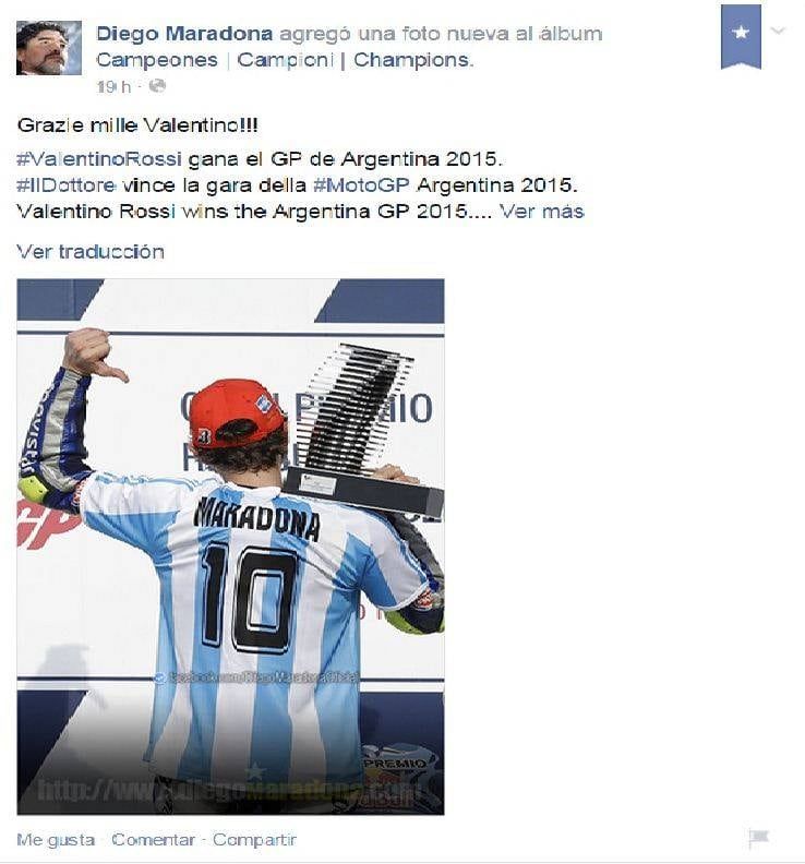 El piloto italiano Valentino Rossi siempre demostró su amor incondicional por Maradona y en su paso victorioso por la Argentina lo ratificó.