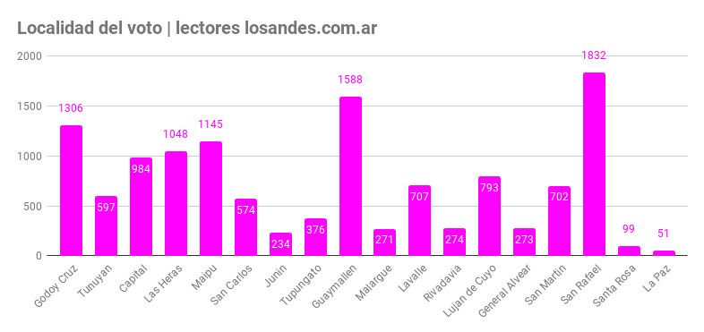 Es importante entender de qué localidad votaron nuestros lectores. San Rafael se encuentra a la cabeza con 1832 votos seguido de Guaymallén con 1587 y Godoy Cruz con 1306.