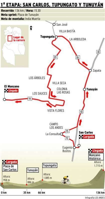 Con un tiempo de 3 horas, 8 minutos y 48 segundos, Gonzalo Najar se adjudicó la primera etapa de la Vuelta Ciclista de Mendoza que comprendió los departamentos de San Carlos, Tupungato y Tunuyán.