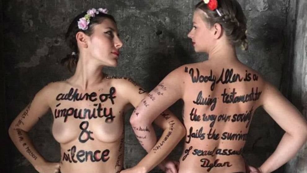 En la noche del martes, dos activistas con los pechos al aire interrumpieron un concierto de jazz con el famoso director Woody Allen en protesta por supuesto abuso de la hija de Allen, Dylan Farrow.