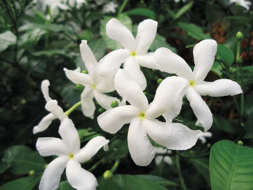 Enredaderas: Jazmín de arabia (Jasminum sambac), rosa bansiana (Rosa banksiae), etc.