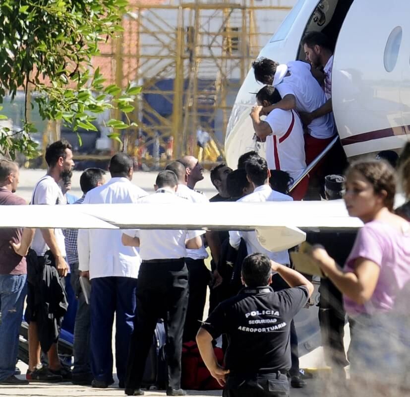 El avión fue esperado por una ambulancia para trasladar al volante Patricio Toranzo, a Diego Mendoza y al preparador físico Pablo Santella quienes seguirán un tratamiento de sus respectivas lesiones en nuestro país.